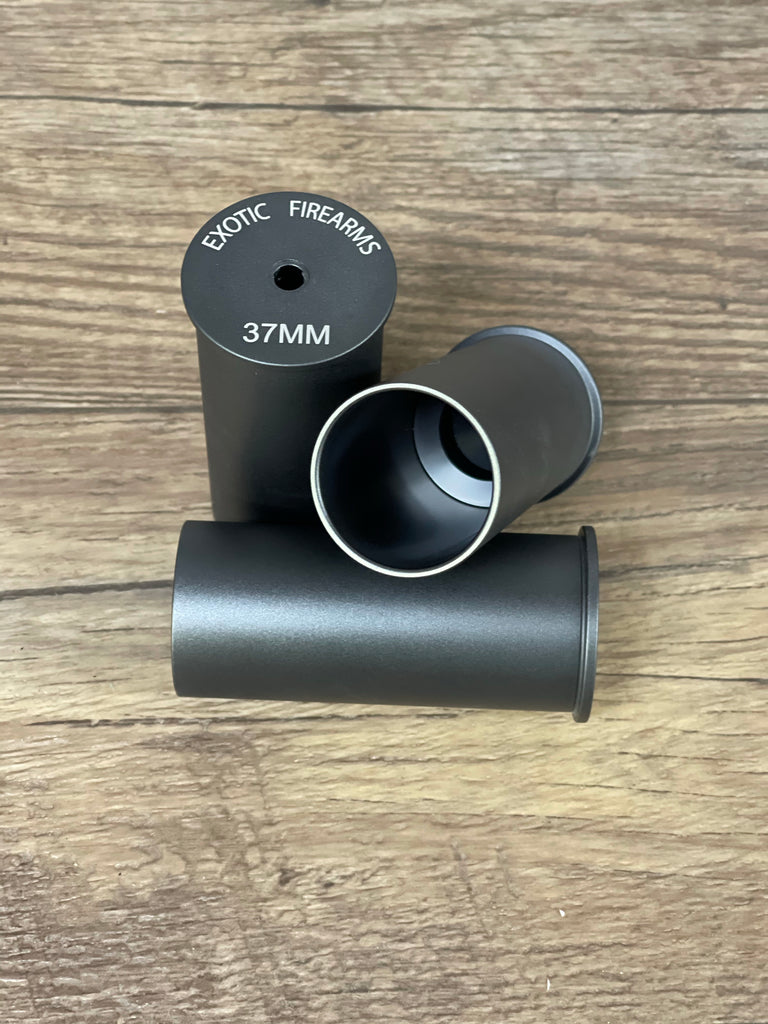 New unfired limited edition Gunmetal Grey anodized 37mm aluminum hull. For use with black powder loads and black powder substitute. Do not use smokeless powder in the 37mm aluminum casing. Uses a #209 shotgun primer. These are 3.5" long with a milled in powder bushing. Price is per individual casing. Very Limited Quantity