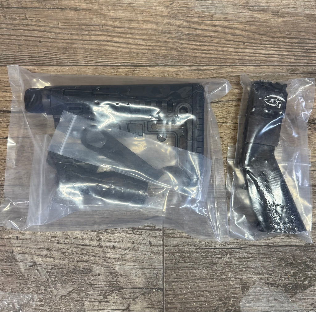 Kit includes Adapter block with pistol grip, Stock with buffer tube, and foregrip.